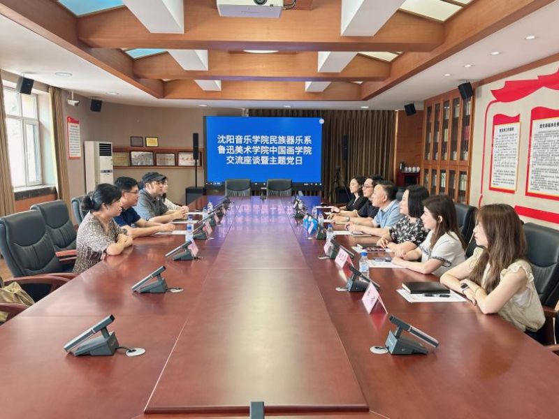 为深入学习贯彻习近平新时代中国特色社会主义思想和党的二十大精神,推进主题教育走深走实,7月4日上午,沈阳音乐学院民族器乐系党总支、鲁迅美术学院中国画学院党总支共同开展主题党日活动。两单位领导班子带领师生党员一同参观沈阳音乐学院民族乐器陈列馆,并开展交流座谈。在陈列馆里,民族器乐系学生侯湉鸽、吕妙燃为大家演奏古琴曲《酒狂》和阮曲《冰山上的来客(片段)》,讲解乐器与乐曲背后的音乐故事。座谈会上,民族器乐系主任魏国教授、党总支书记常亮和中国画学院党总支书记刘新、副院长赵斌一致表示,作为延安鲁艺继承者,民乐与中国画同根同源,担负着传承中华优秀传统文化的共同责任,未来在视觉与听觉相结合、增强艺术表现力上合作空间广阔。