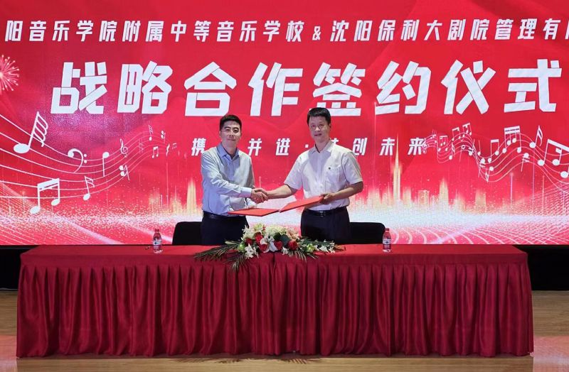 王青雨、曹野代表双方签署战略合作协议。双方就积极推进附中艺术实践基地建设、与盛京大剧院联合举办音乐惠民活动进行了深度探讨与合作。通过音乐惠民活动,使附中专业师生融入音乐展演平台,音乐实践平台、音乐艺术普及教育平台,致力于由剧院辐射至全社会,为沈阳及周边城市居民带来更好的音乐及教育体验,从而打造合作共赢的良好局面,积极推动音乐教育事业和社会美育工作的发展和繁荣。