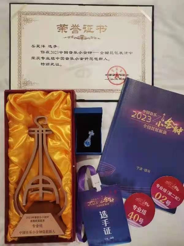 在2023年7月28日刚刚结束的“2023中国音乐小金钟——全国琵琶展演”比赛中,我校民乐学科琵琶演奏专业高二学生岳昊洋(指导教师:邵笑)经过激烈角逐最终荣获“专业组中国音乐小金钟琵琶新人”的优异成绩。