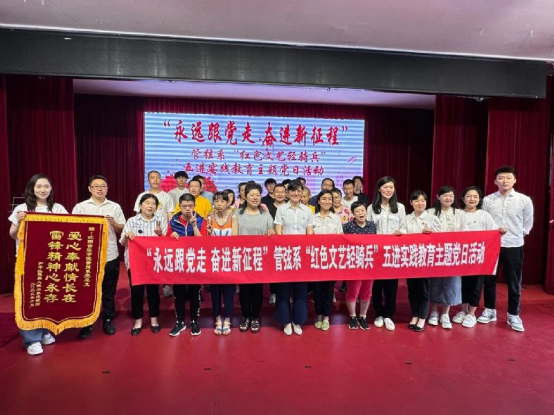 为学习贯彻党的二十大精神,扎实开展学习贯彻习近平新时代中国特色社会主义思想主题教育,落实学院《关于在“七一”期间开展系列活动的通知》要求,积极营造喜迎“七一”的浓厚氛围。6月21日,管弦系党总支“红色文艺轻骑兵”带着精心编排的文艺节目走进沈阳市残疾人就业基地,开展“永远跟党走 奋进新征程”管弦系“红色文艺轻骑兵”五进实践教育主题党日活动。基地残障人士和残疾人工作者集体观看了文艺演出。