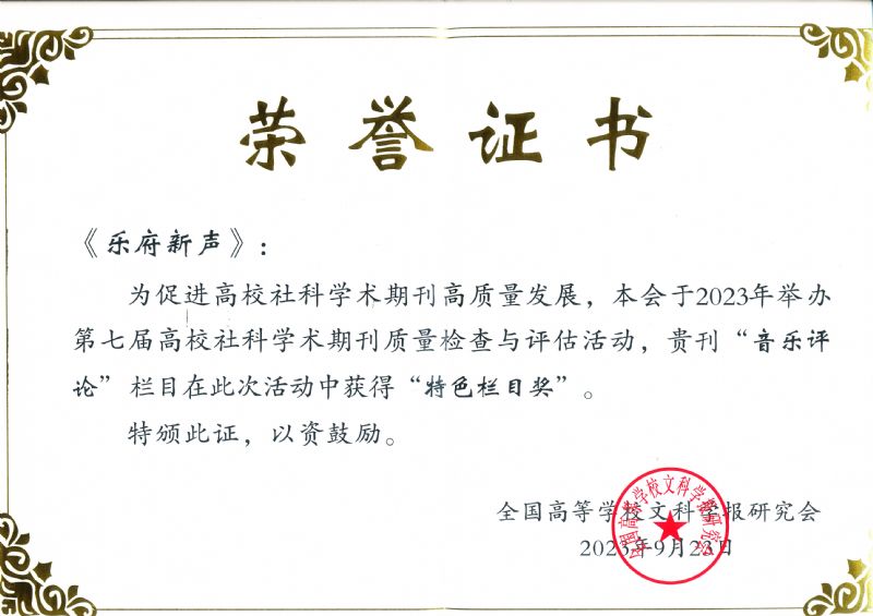此次获奖,将有助于进一步提高《乐府新声》的学术影响力,对推动学院科研与教学发展具有积极影响和作用。