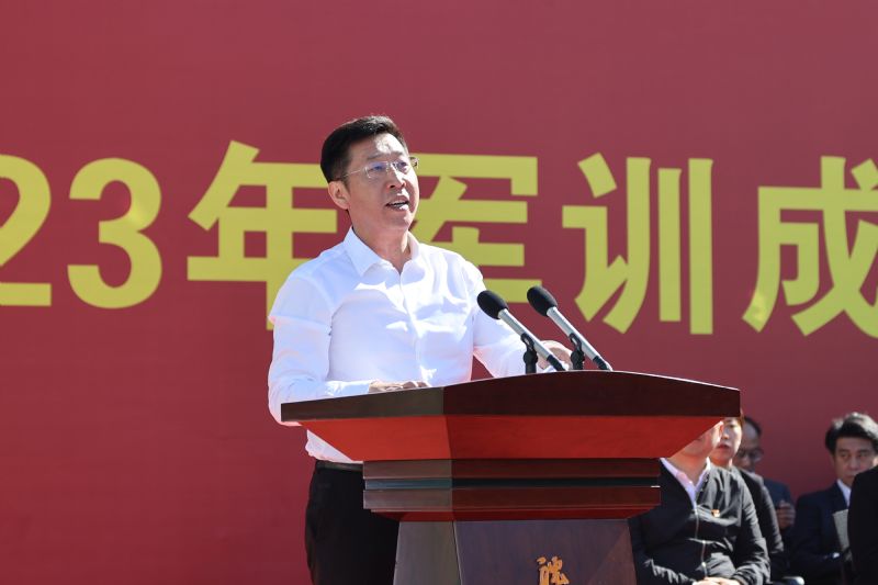 典礼上,举行了军训成果汇演。伴随着开训的口令,六名护旗手高擎国旗率先入场。由各院(系)新生组成的38支军训方队依次经过主席台,进行分列式表演。队伍整齐划一、口号响彻云霄、步伐掷地有声、目光坚毅从容,彰显了沈音学子踔厉奋发、勇担使命的坚定决心和昂扬向上、自强不息的精神风貌。