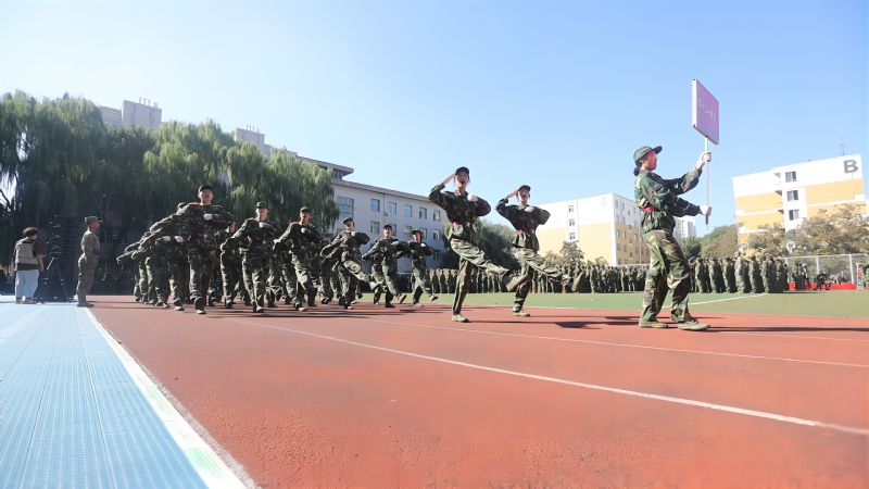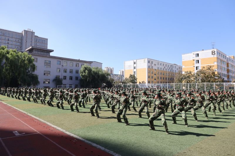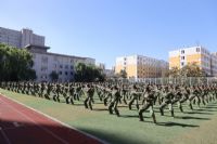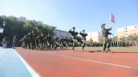 由300名女同学组成的方阵进行军体拳表演。她们动作干净利落,一招一式攻防兼备,尽展巾帼风采。今年正值学院建校85周年,女子方阵手持红色方牌,摆出“紧张、严肃、刻苦、虚心”校训,在“牢记殷殷嘱托、强国复兴有我”的青春誓言中摆出“85”字样,以此庆祝沈音建校85周年,女子方阵的精彩表演赢得现场师生阵阵掌声。男子百人方阵进行了刺杀操表演。他们手持钢枪,动作有力,士气如虹,一令一动充分展示出蓬勃向上的青春朝气。