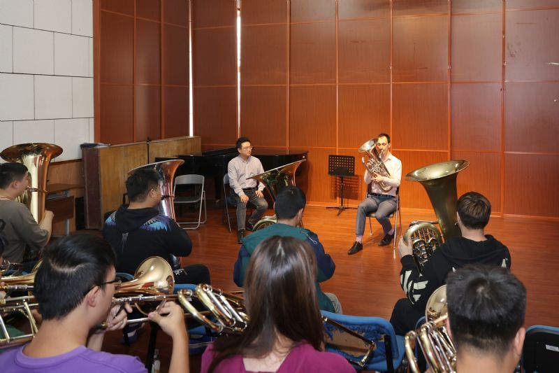 布拉德•卢卡斯主讲了铜管演奏专业大师班,我院管弦系、国际交流合作处相关工作人员及部分师生参加活动。布拉德讲解了铜管专业练习中进行热身准备与日常呼吸训练的方法,强调了呼吸训练在管乐演奏中的重要性。他对学生吹奏的音色进行指导并亲自示范,细心讲授演奏时如何保持良好的身体状态。最后,布拉德与学生共同交流演奏优美音色的秘诀,现场气氛热烈。