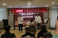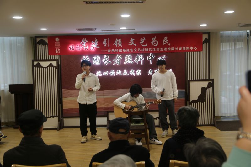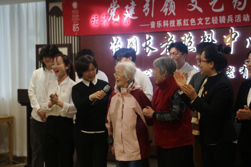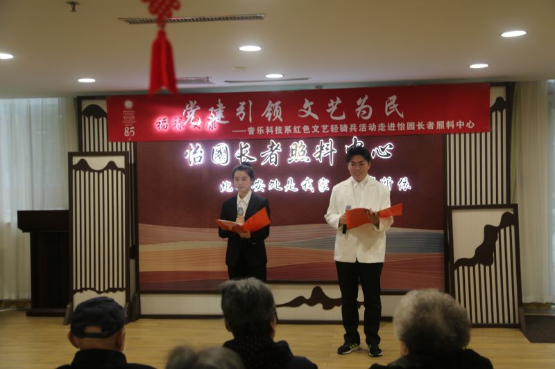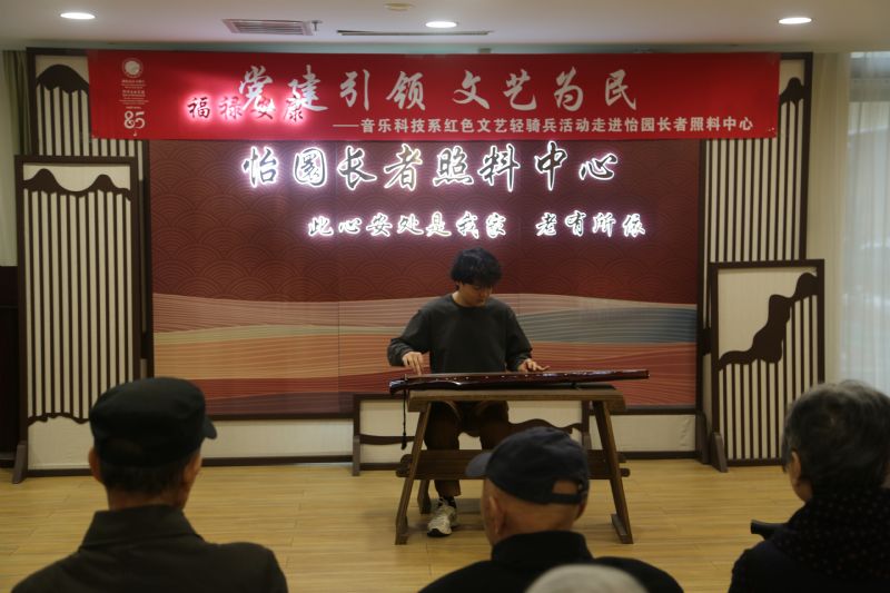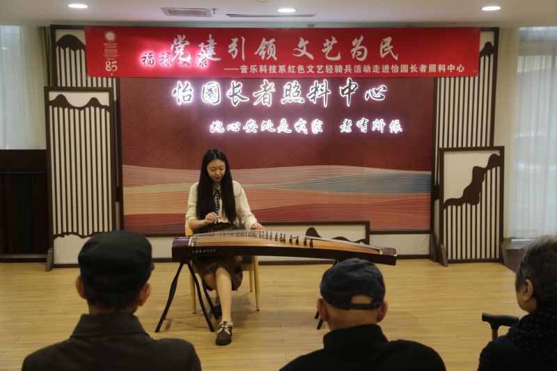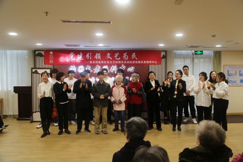 在随后的活动中,音乐科技系师生带来了以创新文艺形式打造的“红色文艺轻骑兵”特色品牌文艺演出。“红色文艺轻骑兵”小分队师生带来了诗朗诵《信念永恒》、歌曲《在希望的田野上》、《月半小夜曲》 、古筝独奏《云水禅心》、古琴独奏《酒狂》、快板《天安门广场看升旗》 等形式丰富多彩的文艺节目。演出现场气氛热烈,掌声雷动,师生和老人们频繁互动,一张张笑脸绽放开来。最后,音乐科技系直属党支部党员师生邀请现场的老人们到台前共同表演,演出在歌曲《我和我的祖国》悠扬的旋律中结束了,师生们和怡园长者照料中心的长者们挥手告别。