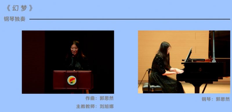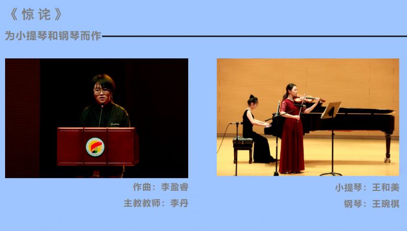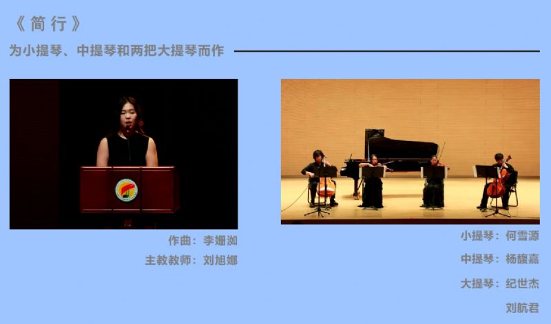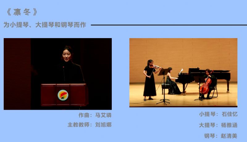 本次音乐会共演出11部作品,均为作曲专业高一、高二年级学生创作的优秀新曲目。这些作品体裁多样,创作风格丰富多元,体现出学生们卓越的创作能力和追求“个性化”“多风格”的音乐特点。值得一提的是,整场音乐会的演奏者、演唱者为附中各年级表演学科的学生。通过与作曲者在写作初衷、创作背景等方面深度沟通,以及对作品的二次创作,使作品的风格与内涵更加完整、准确,精彩呈现在舞台上,彰显出附中学生对音乐作品深度理解和全面展示的能力,展现出附中学生娴熟的演奏技巧和出色的音乐表演力。