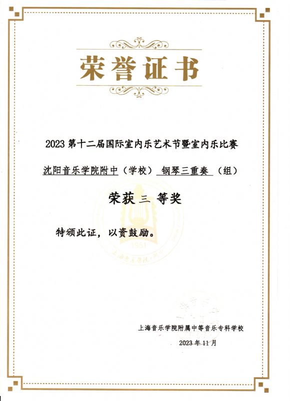 11月11日晚,由上海音乐学院附中主办的第12届国际室内乐艺术节落下帷幕。本次室内乐艺术节的主题为“融合.乐享”,意在通过更多的合作与交流,更多的研究与探索,共同致力于打造青少年室内乐教育国际平台。艺术节为期5天,共邀请来自国内11所音乐院校附中及天津茱莉亚学院(预科)、韩国国立艺术大学艺术英才教育院(预科)的师生们参加了艺术节,内容包括3场音乐会、80余次大师班公开课、1场专题研讨会、3场专家讲座以及室内乐比赛。我校张明副校长在研讨会上做了题为“以培养应用型人才为导向的室内乐教学实践”的发言。本次艺术节的比赛环节,除演奏自选作品外,新增加了一首原创中国作品,并要求在四天时间内独立完成。由我校键盘学科学生王苒溪(初三)、管弦学科学生冮茗卉、徐小荔(高一)组成的钢琴三重奏全程参与了本次艺术节,并在室内乐比赛的环节,克服重重困难,最终获得三等奖的好成绩!