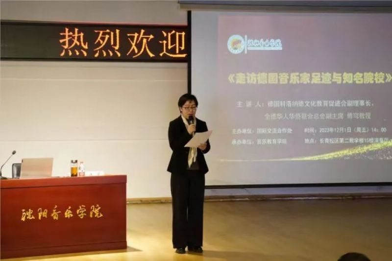 在沈阳音乐学院建校85周年之际,德国科洛纳德文化教育促进会副理事长、全德华人华侨联合总会副主席傅穹受邀于2023年12月1日在长青校区为音乐教育学院师生作《走访德国音乐家足迹与知名院校》的专题讲座。音乐教育学院院长吴家军、副院长孙宏娟及音乐教育学院300余名师生参加活动,讲座由音乐教育学院副院长孙宏娟主持。