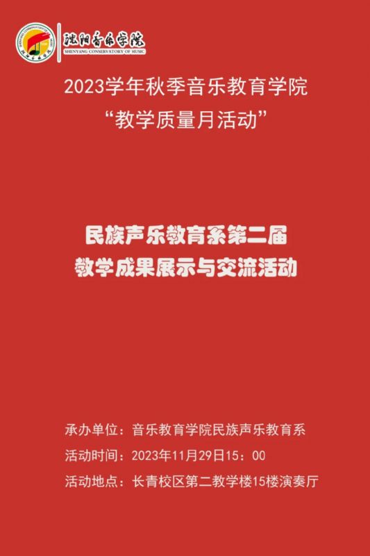 民族声乐教育系于2023年11月29日在长青校区第二教学楼15楼演奏厅举办了“民族声乐教育系第二届教学成果展示与交流活动”。