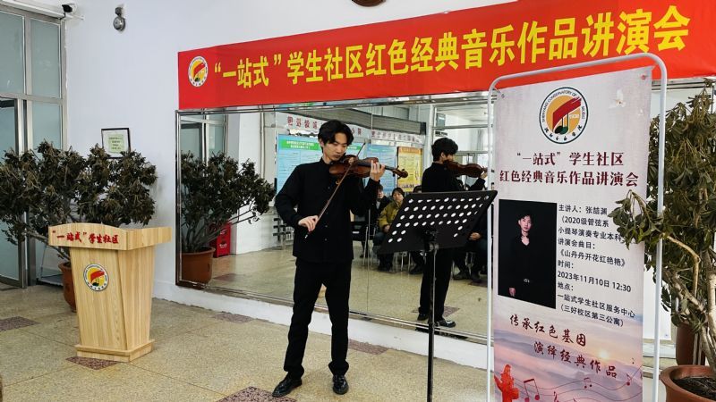 11月10日,第十五期“一站式”学生社区红色经典音乐作品讲演会在三好校区“一站式”学生服务中心举行。学生处、管弦系相关负责同志与学生代表50余人参加讲演会。讲演会由管弦系辅导员李曼主持。