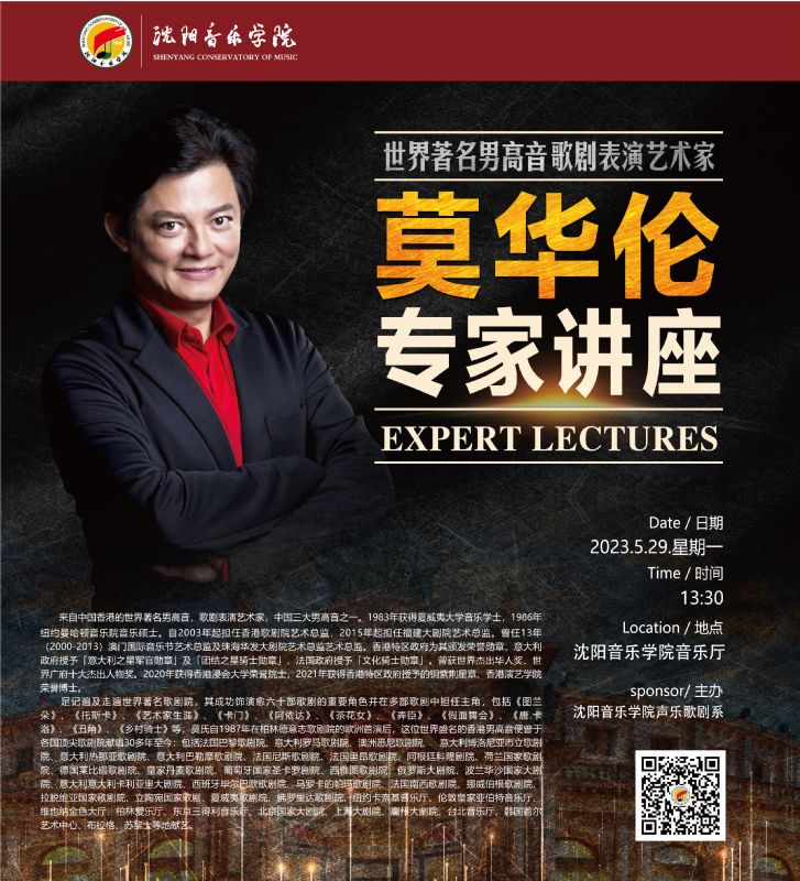•             5月29日下午,声乐歌剧系邀请世界著名男高音、歌剧表演艺术家莫华伦在音乐厅举办声乐大师班,沈阳音乐学院音乐厅座无虚席,师生们翘首以盼。我院主持行政工作副院长冯志莲为莫华伦颁发了客座教授聘书,仪式由声乐歌剧系主任张策主持。仪式结束后,与会领导和师生共同聆听了莫华伦的声乐大师课。