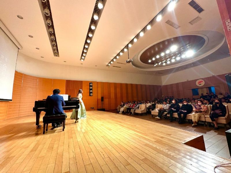 整场音乐会共十二首曲目,他们用自己独特的嗓音和动人的表演,为观众们带来了一场真正的视听盛宴。本次音乐会汇聚了十二位优秀学生,他们通过辛勤的排演,用自己的热情和才华演绎了李斯特、普朗特、马尔蒂尼的艺术歌曲,奥芬巴赫、古诺、比才、圣桑、马斯奈的歌剧咏叹调及重唱这些经典的法语声乐作品,为观众呈现了一场精彩纷呈的表演。出席音乐会的嘉宾有我系领导、老师们,法国驻沈阳领事馆文化教育领事Charlene女士及积极向上的同学们。通过法语声乐作品演唱课的学习,同学们在法语发音规范、法国作曲家的演唱风格等方面对法国声乐作品及法国文化有所了解和感悟。我们相信这一次实践不仅对学生们的音乐之路有很大的帮助,也会为他们未来指明努力的方向。