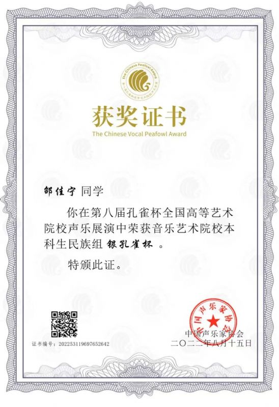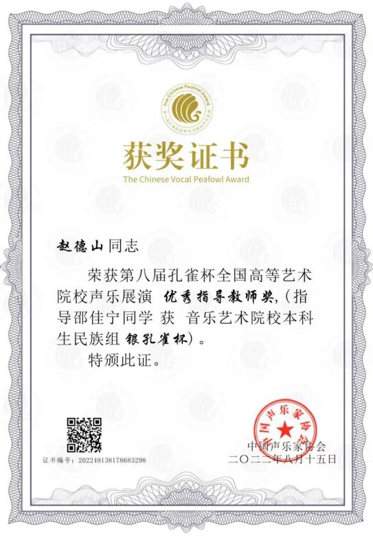 8月14日,第八届孔雀杯全国高等艺术院校声乐展演活动在宁波圆满落幕。我系学子在比赛中表现出色,喜获佳绩。其中,2019级本科生邵佳宁荣获音乐艺术院校本科民族组银孔雀奖,我系教师赵德山教授获优秀指导教师奖。