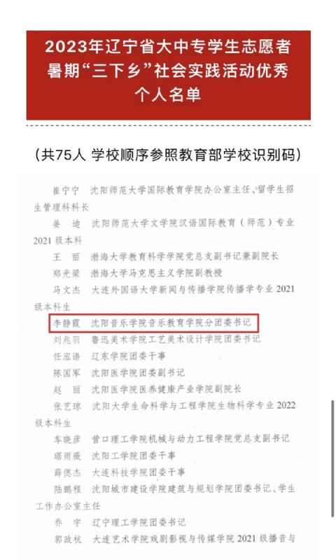 在共青团辽宁省委员会、辽宁省学生联合会共同开展的2023年辽宁省大中专学生志愿者暑期文化科技卫生“三下乡”社会实践活动中,音乐教育学院分团委书记李静霞荣获优秀个人荣誉称号。