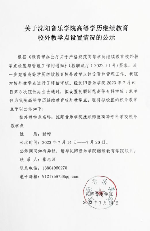 关于沈阳音乐学院高等学历继续教育校外教学点设置情况的公示