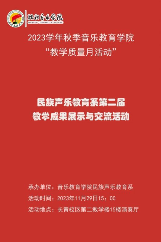 民族声乐教育系于2023年11月29日在长青校区第二教学楼15楼演奏厅举办了“民族声乐教育系第二届教学成果展示与交流活动”。