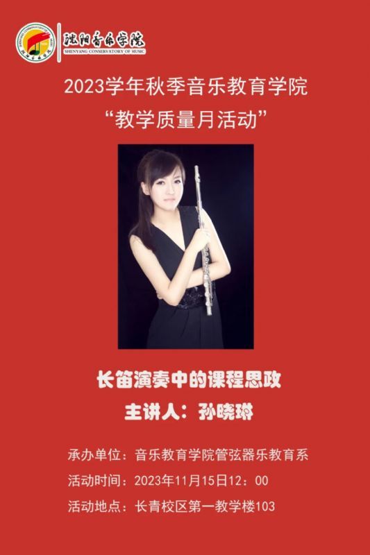 2023年11月15日12时,在长青校区第一教学楼103举办了《长笛演奏中的课程思政》公开课,主讲人为管弦器乐教育系长笛教师孙晓琳。