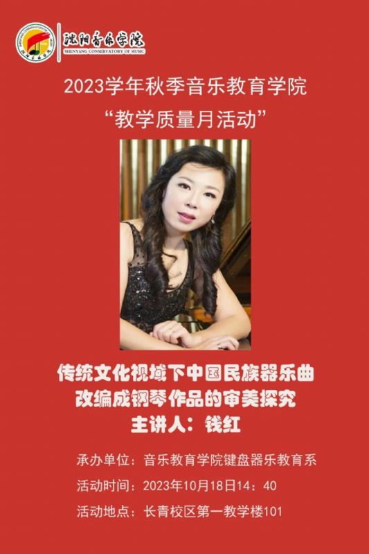 2023年10月18日,在长青校区第一教学楼0101教室,键盘器乐教育系举办了一场由钱红教师主讲的《传统文化视域下中国民族器乐曲改编成钢琴作品的审美探究》公开课。