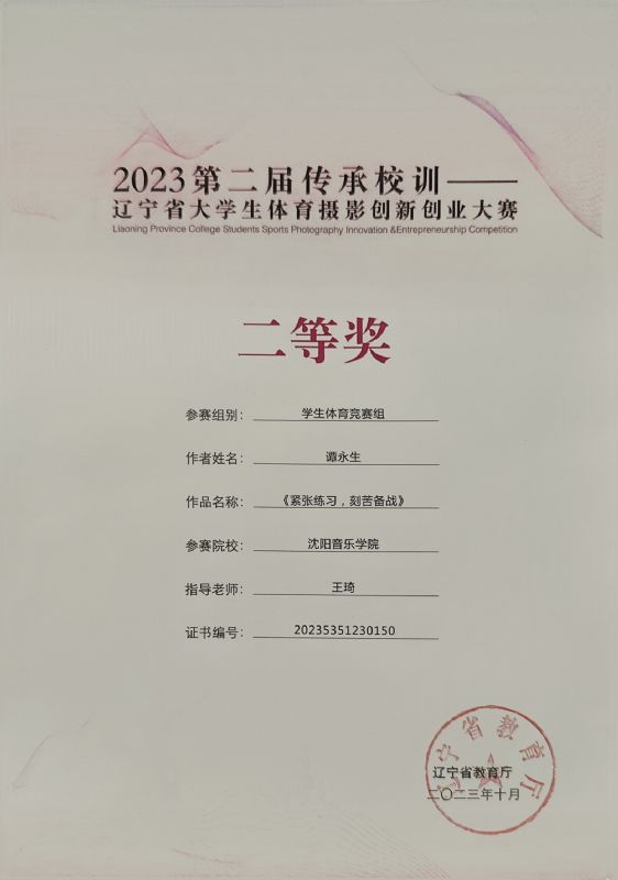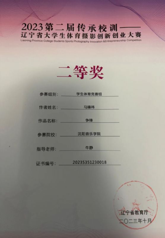 在《第二届“传承校训”——辽宁省大学生体育摄影创新创业大赛》中,我部门教师赵莹指导的项目获得省级一等奖,王琦、柳誉青、牛静指导的项目分别获得省级二等奖。