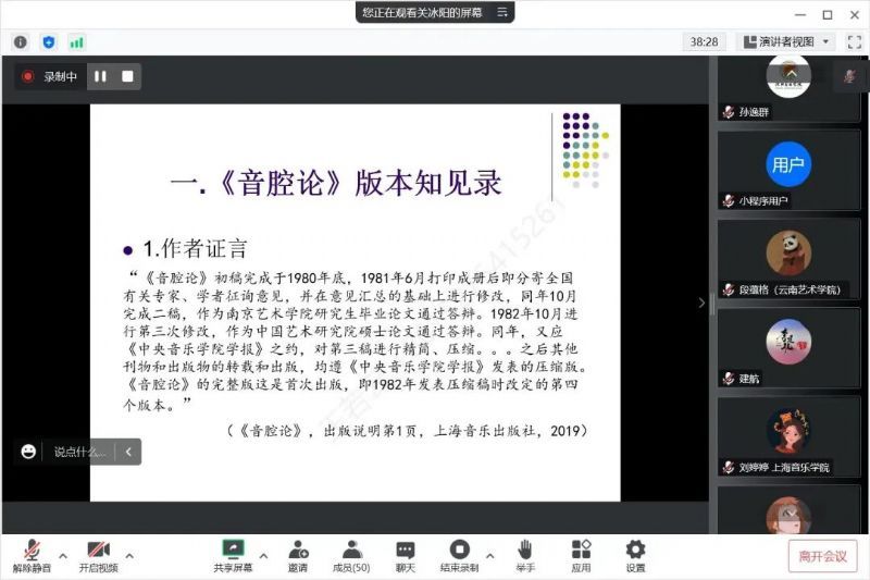 本次读书会通过网络平台展开,取得了圆满成功,这次以沈洽著作《音腔论》为核心展开的多方探讨也体现了中国传统乐研究是活跃的、具有学科特色的。在会上,各位老师与同学的思想各美其美,最终达到了美美与共,砥志研思的良好学术效果。特别感谢参会师生对沈阳音乐学院音乐学系、音乐舞蹈研究所的支持,也期待下次的再相聚!