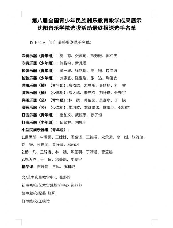 第八届全国青少年民族器乐教育教学成果展示 沈阳音乐学院选拔活动最终报送选手名单