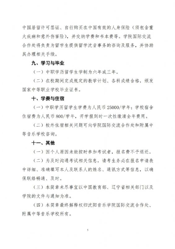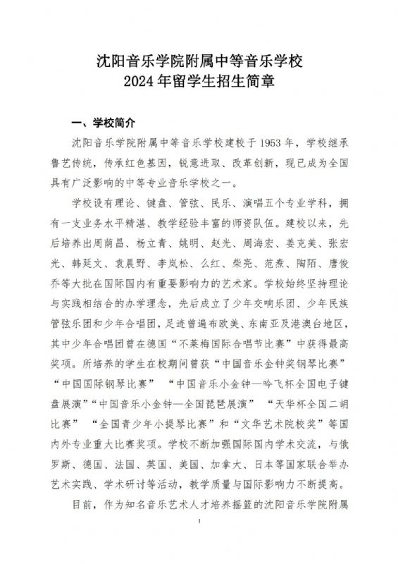 沈阳音乐学院附属中等音乐学校2024年留学生招生简章