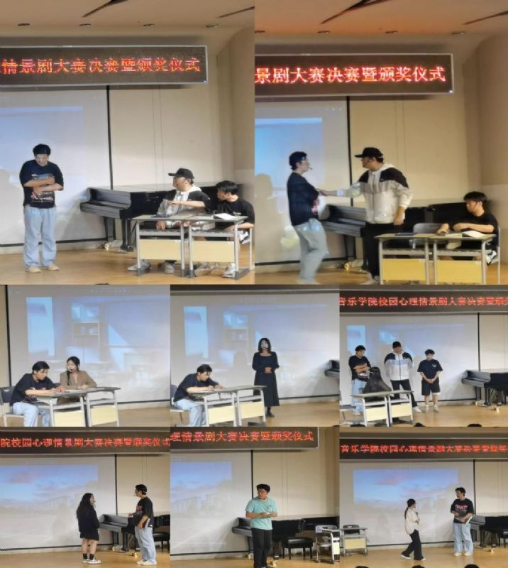 •        5月24日,由学生处举办的沈阳音乐学院第七届校园心理情景剧大赛决赛暨颁奖典礼在第二教学楼424多功能厅隆重举行。我系参赛作品《将心比“心”》从11部参赛作品中脱颖而出,晋级决赛。在现场6部作品的激烈角逐中,赢得在场评委及观众的高度认可,荣获2024年沈阳音乐学院第七届校园心理情景剧大赛二等奖。