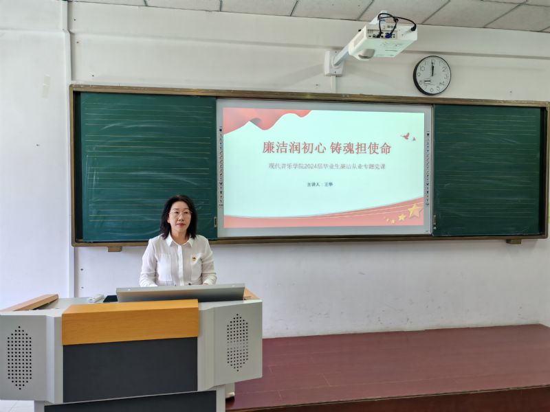 2024年6月19日,王华以“廉洁润初心 铸魂担使命”为主题,分别从廉政文化、涵养廉洁自律的道德修为、以廉洁故事涵养清廉之风、以廉洁自律践行清廉表率等方面为毕业生讲授廉洁从业专题党课,分享了廉洁警句格言,讲述了焦裕禄、王进喜等廉洁人物的故事,勉励即将走向社会的同学们堂堂正正做人,干干净净做事。