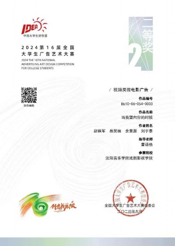 近日,在2024第16届全国大学生广告艺术大赛中,我院影视摄影与制作系2022级学生赵铁军、岳昊楠、余意源、刘宇泰创作的作品《当我望向你的时候》荣获视频类微电影广告二等奖(指导教师:曹语格)。 特此祝贺!