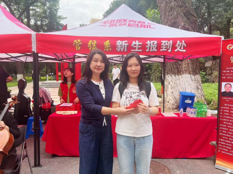 报到当天,管弦系领导班子早早地等候在迎新现场,为新生们精心准备了具有专业特色风格的木质小吉他U盘作为伴手礼,送给每一位报到新生。