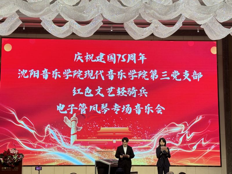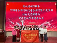 • 为庆祝中华人民共和国成立75周年,9月27日下午,沈阳音乐学院“红色文艺轻骑兵”第82小分队(现代音乐学院第三党支部)走进浑南区泰康之家·沈园养老服务有限公司,为老人们献上了一场精彩的文艺演出。活动由现代音乐学院副院长、第三党支部书记唐晓博组织带队,第三党支部学生党员、积极分子代表参与演出。