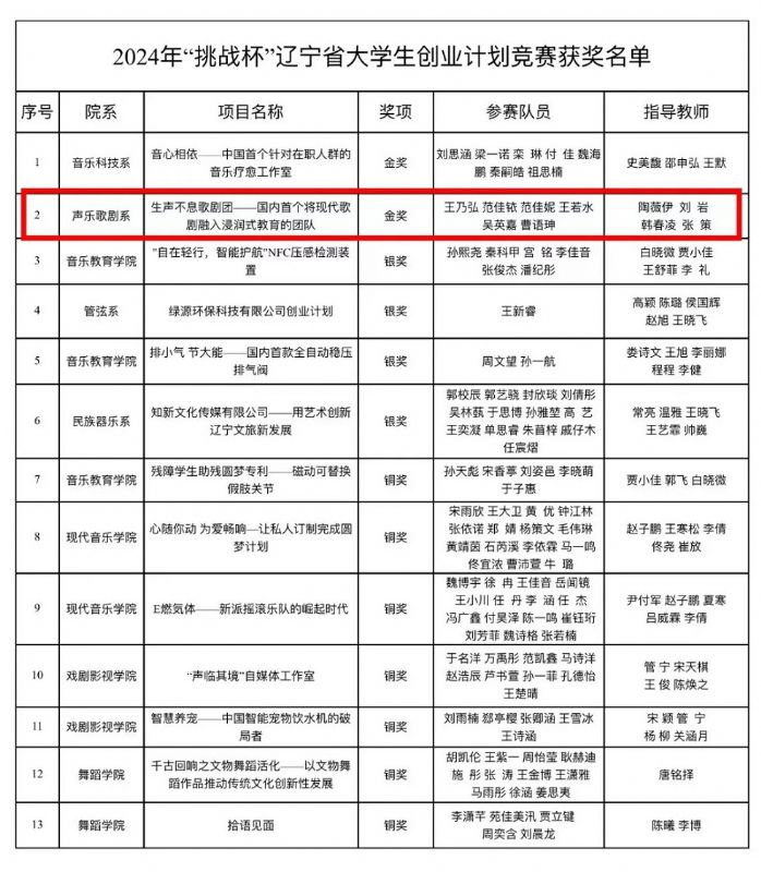 在共青团辽宁省委员会、辽宁省教育厅、辽宁省科学技术厅、辽宁省人力资源和社会保障厅、辽宁省知识产权局、辽宁社会科学院、辽宁省科学技术协会、辽宁省学生联合会联合主办的2024年“挑战杯”辽宁省大学生创业计划竞赛中,我系申报的参赛项目:生声不息歌剧团——国内首个将现代歌剧融入浸润式教育的团队,荣获辽宁省金奖。