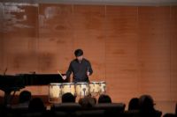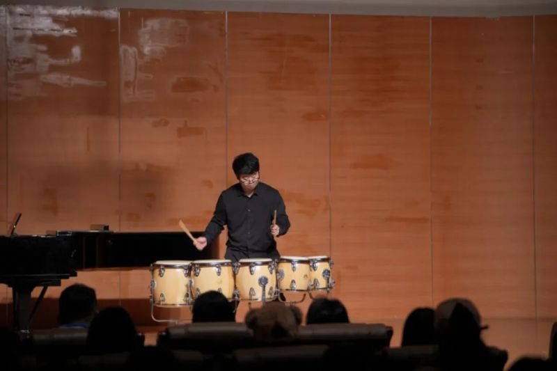 打击乐独奏《筵》,演奏者通过精准的击奏和灵活的手腕动作,使鼓声时而激昂澎湃,时而细腻柔和,让我们感受到了鼓声传达战争得胜后的喜悦和欢庆之情。