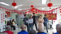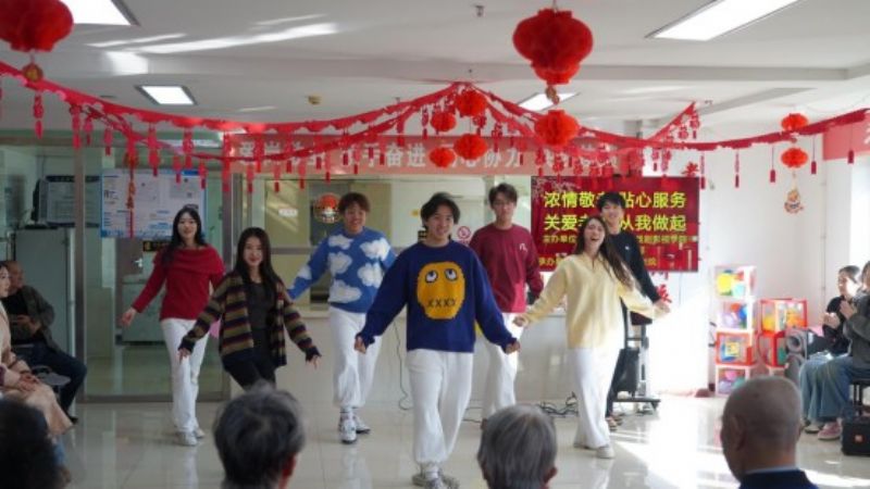 当天下午,养老院一楼大厅座无虚席,老人们早早落座,翘首以盼师生们的到来。“你的心情,现在好吗?你的脸上,还有微笑吗……”一曲《祝你平安》拉开演出的序幕。舞蹈《踏浪》迎着徐徐微风踏浪而来,快板《学雷锋》生动形象讲述了雷锋一个个无私奉献、助人为乐的故事,将欢乐的气氛瞬间拉满,赢得老人们阵阵掌声。优雅轻盈的歌舞《上春山》、惊艳现场的川剧《变脸》、韵味十足的京剧《定军山》、热情奔放的串烧歌舞,带着爷爷奶奶们时而穿梭在云雾缭绕的春山路上,时而惊艳于色彩斑斓的脸谱之中,时而领略京剧文化的独特魅力,时而感受扑面而来的青春活力。传统文化的深厚底蕴和时代新声的青春气息,给老人们带来别开生面、耳目一新的视听享受。“日落西山红霞飞,战士打靶把营归,把营归……”养老院活动室里,在同学们的带动下,老人们唱起了《打靶归来》,熟悉的旋律,让他们回忆起往昔的峥嵘岁月,陶醉在美妙的音乐世界。整场演出老人们参与度极高,个个喜上眉梢,笑声、掌声、歌声不断,欢声笑语在养老院内久久回荡,真挚的关怀如丝丝细雨般滋润着老人们的心田。