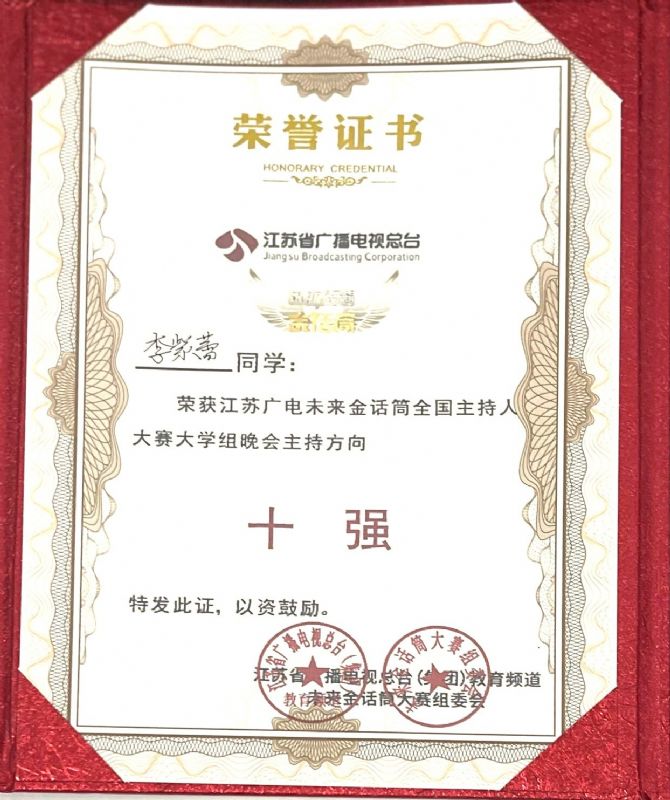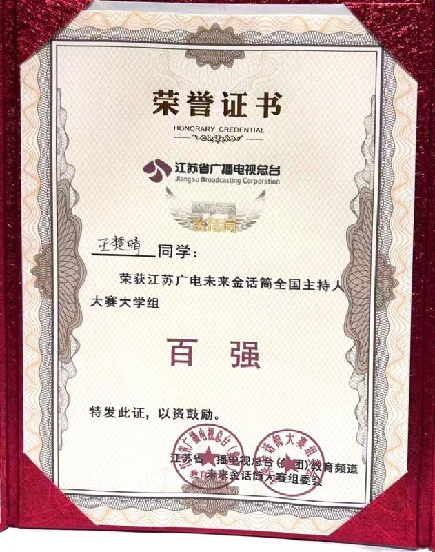 近日,在江苏省广播电视总台主办的2024年江苏广电“未来金话筒”全国主持人大赛总决赛中,我院播音与主持系2021级学生张焕铎荣获大学组(赛事解说赛道)全国亚军(指导教师:宋宇);2022级学生李紫蕾荣获大学组(晚会赛道)“全国十强”选手称号(指导教师:宋宇);2022级学生王楚晴荣获大学组“全国百强”选手称号(指导教师:刘铮)。