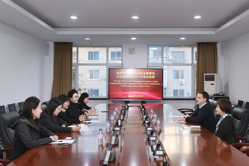 王硕对韩安山一行表示热烈欢迎,并简要介绍了学院的发展概况、办学特色以及近年来在国际交流与合作方面取得的成就。王硕表示,学院一直以来致力于推动与国际高水平教育机构的交流,十分重视与美国音乐院校和艺术团体的合作。她谈到,今年5月,双方共同举办的中美建交45周年民间音乐交流演出和快闪活动,反响热烈并取得了圆满成功。她对美国驻沈阳总领事馆在中美交流活动中给予学院的支持和帮助表示感谢,并希望双方未来能在文化、教育等领域进一步交流与合作。