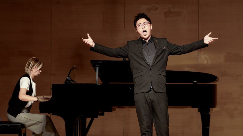 2022级研究生崔洪瑞演唱歌剧《沂蒙山》选段《爱永在》,将剧中人物林生对家乡和亲人的眷恋之情演绎得淋漓尽致。第二首多尼采蒂歌剧《军中女郎》中的选段“Ah mes amis”被誉为男高音的试金石,他精彩的演唱,赢得了现场观众的阵阵欢呼。