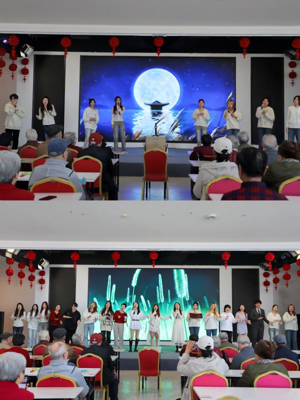 本次活动由国际教育学院副院长夏寒、附属中等音乐学校党总支副书记谢晓宇带队。师生们早早地就来到了养老院,和老人们唠家常,关心老人们的健康状况。小分队精心设计演出了包括独唱、重唱、小合唱、联唱、独奏、重奏等十余个节目。既有深受老年人喜爱的《月亮代表我的心》《小城故事》《橄榄树》《我是一条小河》等经典老歌,又有脍炙人口的《红尘情歌》《鸿雁》《苹果香》等流行单曲。扬琴独奏《秧歌》、竹笛独奏《帕米尔的春天》、二胡重奏《赛马》,极具地域风情,带来强烈的艺术感染力。学生们还演出了由我院老院长秦咏诚创作的《满怀深情望北京》,我院知名校友、著名作曲家谷建芬教授创作的《今天是你的生日》,深入人心的旋律使得在场的老人们也一同歌唱起来,现场气氛达到了高潮。节目最后,在场师生与老人们合唱《明天会更好》,共同祝愿老人们身体健康,祖国繁荣昌盛。学生们的精彩演出让平日里安静的养老院变得热闹起来,收获了在场所有老人和养老院职工的阵阵掌声。