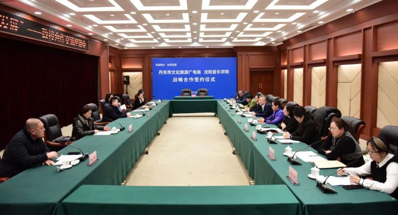 张策与丹东市文化旅游和广播电视局党组书记、局长徐敏签署合作协议。丹东市委宣传部、融媒体中心、教育局负责同志,我院招生就业处、艺术实践中心、对外合作办公室、管弦系负责同志参加座谈。