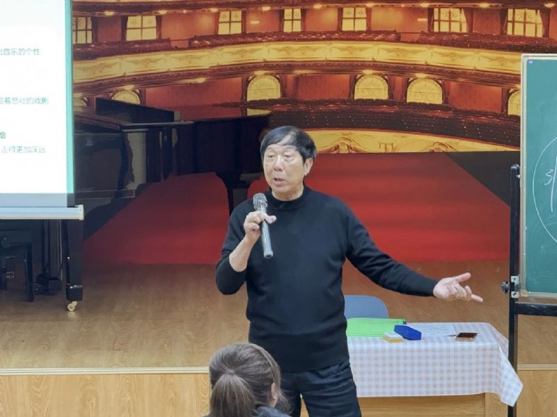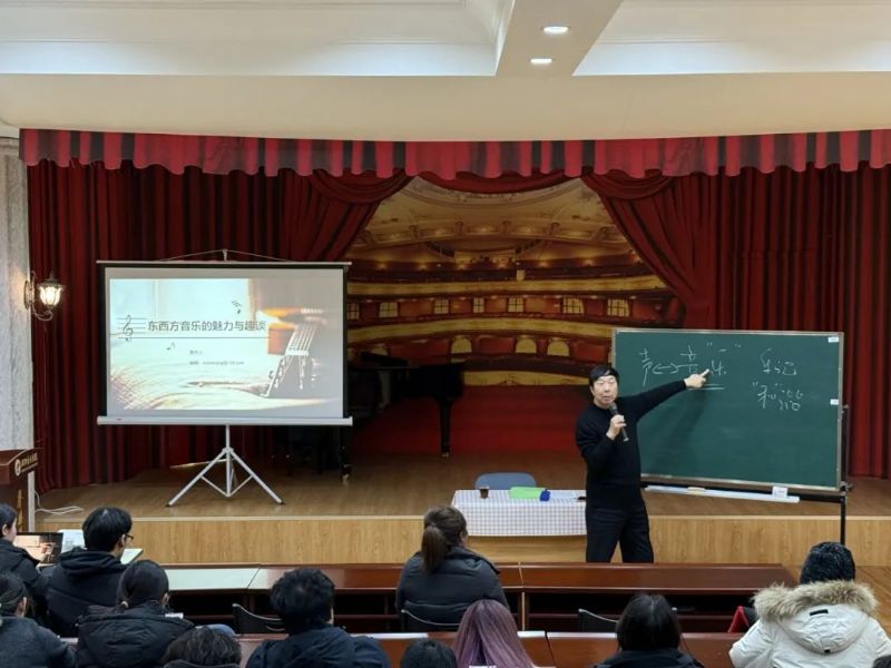 景作人教授凭借其深厚的音乐造诣和幽默风趣的语言,带领全体师生共同探究东西方音乐的独特魅力及其风格特征,首先,他提出音乐起源有多种说法,如劳动创造说,像劳动号子逐渐演变;还有古希腊哲学家赫拉克利特认为人类音乐起源于模仿鸟鸣,英国哲学家斯比赛认为是人类对动物的本能模仿,达尔文则认为音乐产生与动物求偶叫声有关等。
