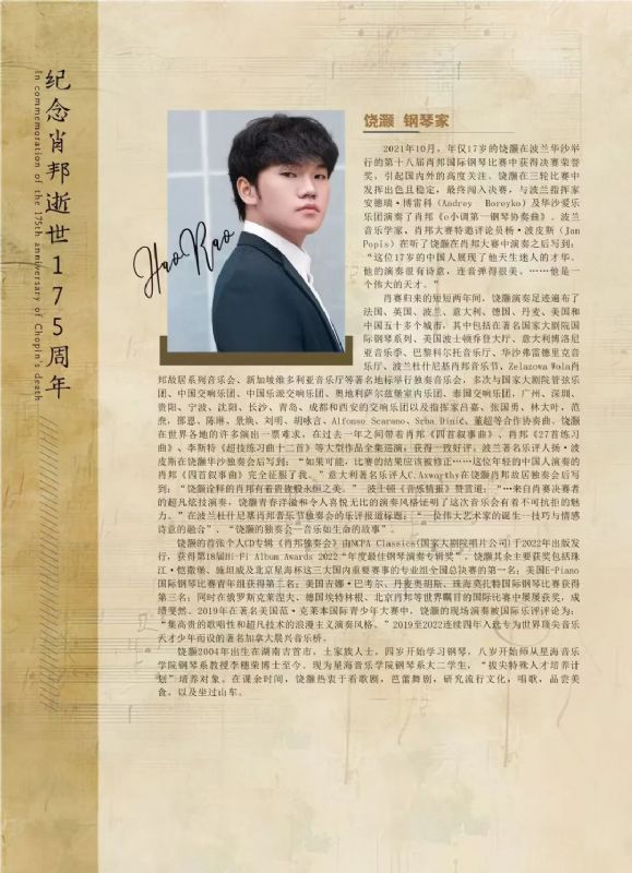预告丨纪念肖邦逝世175周年 青年钢琴家饶灏 肖邦专场钢琴独奏会