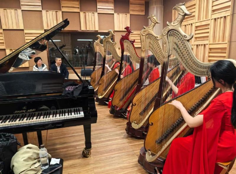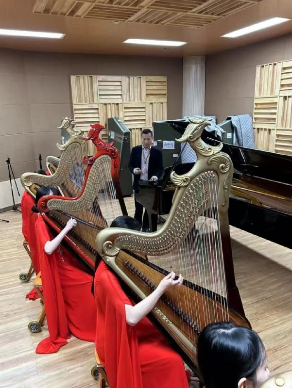 受中央音乐学院的邀请,沈阳音乐学院弘韵箜篌乐团在系主任张科威的带领下,与箜篌专业指导教师贺虹教授及林嫣、王锌睿、邴渏嫙、张家赫、张栩然五位乐团成员一道亮相高等音乐院校专场音乐会。乐团精彩呈现了箜篌五重奏《梦回龟兹》,该曲由著名作曲家王丹红创作,费诚改编。乐曲以其悠扬梦幻的旋律,生动描绘了千年前龟兹古国的音乐画卷。五位演奏者技艺精湛,紧密协作,将箜篌独特的空灵音色与丝路文化的深厚韵律相结合,使濒于失传的古老乐器重新焕发出生命力,赢得了在场观众的热烈反响及专家们的高度评价。