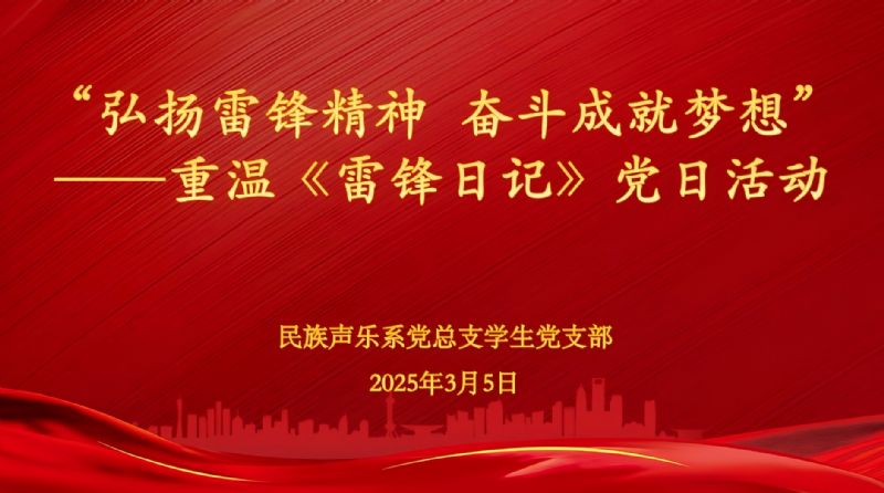 • 按照《沈阳音乐学院“弘扬雷锋精神 奋斗成就梦想”2025年春季“开学第一课”活动工作方案》部署,3月5日,正值第62个学雷锋纪念日,民族声乐系党总支和学生党支部举办了一场以“弘扬雷锋精神 奋斗成就梦想”重温《雷锋日记》为主题的党日活动,旨在深入学习贯彻习近平总书记关于弘扬雷锋精神的重要论述,引导广大党员青年积极践行雷锋精神,厚植为民情怀。