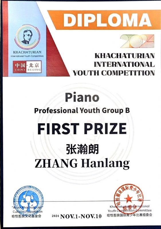 在11月1日至10日举办的哈恰图良国际青少年音乐比赛中,张瀚朗(指导教师李晓军) 在历经澳门预选赛、北京复赛、半决赛的多轮激烈角逐后,最终脱颖而出,进入决赛。在决赛中,他与国际著名指挥家谢尔盖·辛巴特扬执棒的亚美尼亚国家交响乐团携手,精彩演绎了莫扎特钢琴协奏曲K.415(第一乐章)和普罗科菲耶夫第三钢琴协奏曲Op.26(第一乐章),精湛的演奏技艺和音乐表现力赢得了评委和观众的一致好评,荣获最高奖项及奖金。