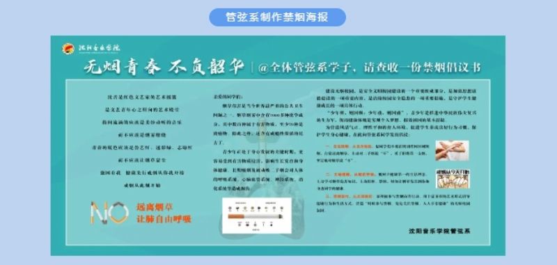为弘扬健康文明的校园文化,提升大学生们的健康意识和自我保护能力,管弦系根据学院《关于营造“无烟青春 不负韶华”校园无烟环境的通知》工作要求,在全系范围内开展禁烟活动,打造无烟校园。
