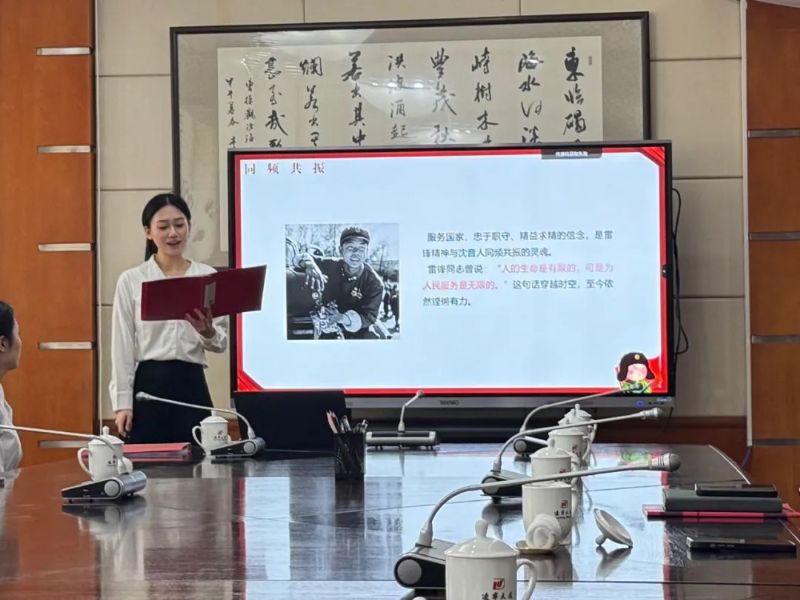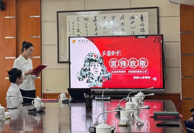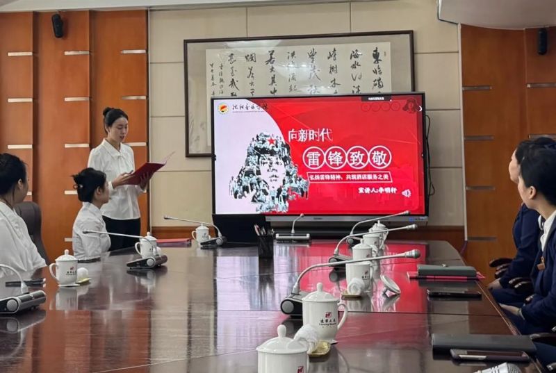 活动伊始,“红色文艺轻骑兵”以“宣讲+音乐”的创新形式,生动诠释了雷锋精神的时代内涵。2023级魏存以《走进雷锋与雷锋精神》为主题,深入解读了雷锋的生平事迹,带领大家走近真实的雷锋,让听众深刻理解雷锋精神的内涵。2022级党员学生朱悦宁以《品味雷锋日记,践行雷锋精神》为题,通过对雷锋日记的细腻解读,引导大家从雷锋的日常记录中汲取力量,将雷锋精神融入到日常生活实践中;2022级党员学生张语格以《继承雷锋传统,弘扬雷锋精神》为题,着重强调了传承雷锋精神的重要性与时代意义,呼吁大家在新时代继续发扬雷锋传统 ;2023级李明轩在以《弘扬雷锋精神,共筑温暖星河》为题的宣讲中,紧密结合辽宁大厦工作实际,阐述了如何在服务岗位上践行雷锋精神,为打造更优质的服务贡献力量;2023级吕思萱以《青年担当,践行雷锋精神》为题,展现了新时代青年在雷锋精神指引下应有的担当与作为;2022级党员学生王语涵则以《践行雷锋精神,服务声入人心》为题,生动诠释了将雷锋精神融入服务工作,用真诚服务打动人心的理念。在讲演会尾声,讲演团成员们激昂地合唱《学习雷锋好榜样》,以歌声传递雷锋精神。曲终,会议厅掌声雷动,辽宁大厦前台接待部高丹经理感慨道:“沈音学子们以艺术的语言赋予了雷锋精神新的生命力,这种校企合作的新模式为红色文化的传播开辟了新的途径。”
