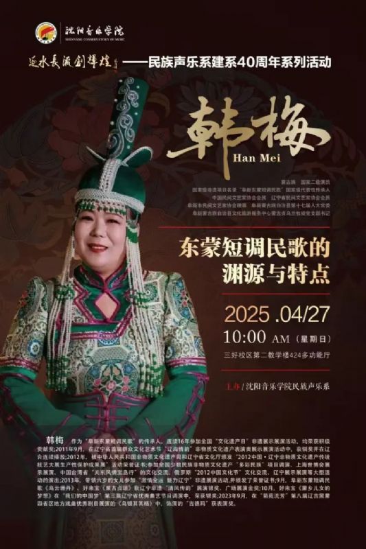民族声乐系建系四十周年系列活动——东蒙短调民歌传承人韩梅“东蒙短调民歌渊源与特点”专题讲座 原创 沈音民族声乐系 沈音民族声乐系 2025年04月22日 09:24 辽宁
