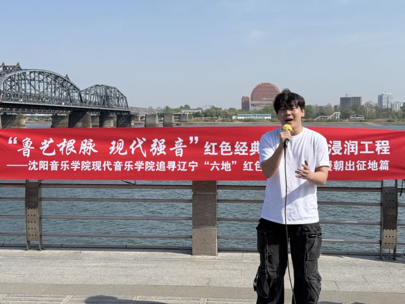 带着对历史的重温和对英雄的缅怀,现代音乐学院在鸭绿江断桥下开展了一场别开生面的红色爱国歌曲路演,将思政教育与艺术实践深度融合。演出以《中国人民志愿军战歌》合唱拉开序幕,铿锵的旋律瞬间点燃现场氛围;歌曲《年轻的朋友来相会》以昂扬风貌向英雄致敬;歌曲《追寻》以悠扬的歌声诠释对理想信念的坚守;吉他弹唱《画》以现代艺术形式演绎家国情怀;萨克斯独奏《就是哪吒》以激昂的节奏展现新时代青年的蓬勃朝气;最后,全体师生齐声高唱《国际歌》,雄浑的歌声在鸭绿江畔久久回荡,吸引众多游客驻足聆听、自发加入,共同完成了一场跨越时空的精神共鸣。