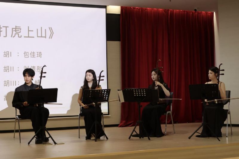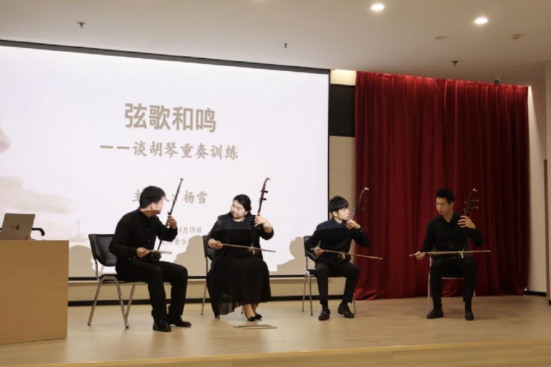 演会上,杨雪与学生带来多首风格迥异的重奏作品:改编自刘天华《良宵》的温馨抒情、民歌《阿拉木汗》的浓郁民族风情、原创作品《嬉戏》的灵动地域特色、《采红菱》的江南水乡意境,以及李博禅创作的《弓弦舞》等,通过细腻运弓、丰富和声与默契配合,展现胡琴重奏在传统与创新中的多元表达,赢得现场热烈反响。