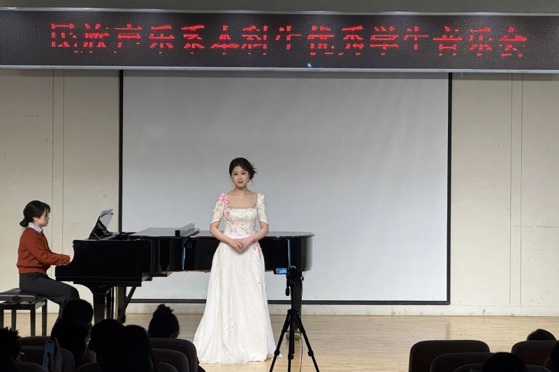 演唱曲目丰富多元,尽显民族声乐的独特魅力。既有洋溢着浓郁地域风情的民歌,如那悠扬婉转的江南小调,带着水乡的温婉与柔情;也有豪迈奔放的西北民歌,仿佛将听众带到了广袤无垠的黄土高原,感受着那片土地上的粗犷与热情。古诗词艺术歌曲则宛如一幅幅古朴典雅的画卷,学生们用细腻的嗓音将诗词中的意境与情感娓娓道来,让人沉醉于古典文化的深邃韵味之中。歌剧选段部分,学生们化身剧中角色,以跌宕起伏的唱腔和生动传神的表演,将歌剧中的爱恨情仇展现得淋漓尽致,引得现场观众沉浸其中,时而屏息凝神,时而掌声雷动。而独具时代特色的创作歌曲,更是展现了学生们对当下生活的敏锐感知和对民族声乐艺术创新的积极探索,旋律中跳动着青春的脉搏,歌词里蕴含着对未来的美好憧憬。